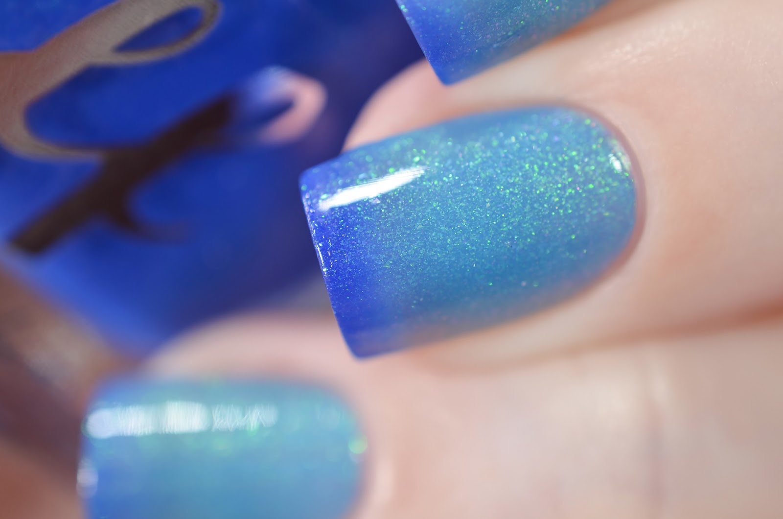 Femme Fatale Deathwatch Beetle - термолак с шиммером Аврора, меняющий свой цвет с голубого (в тепле) на холодный (в холоде). Я использовала лак в три слоя и добавила топ