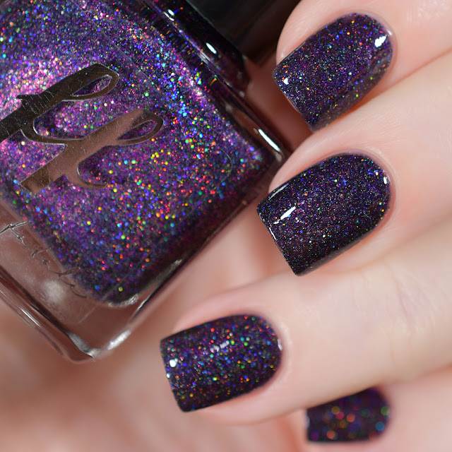 Femme Fatale Falling Moon - лак на прозрачной черной базе с серым гологлиттером, розовым голомикроглиттером и фиолетовым шиммером. Я использовала лак в три слоя и добавила топ